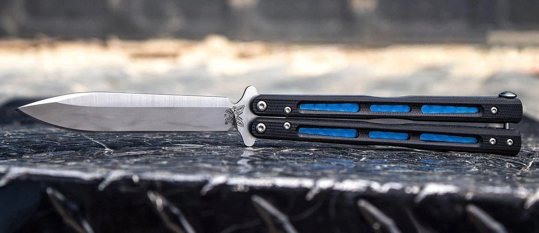 The Benchmade Balisong 51 Knife is a larger version of the Benchmade Balisong 32. The 51 Morpho Balisong Butterfly features a premium D2 steel blade with black G10 handles. The hand polished hardware, jeweled blue titanium liners and Ti carry-clip provide the perfect accent to this great Butterfly Knife. BM51.