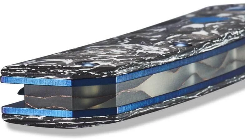 - White and Black Marbled Carbon Fiber handles with blue G10 shield inlay