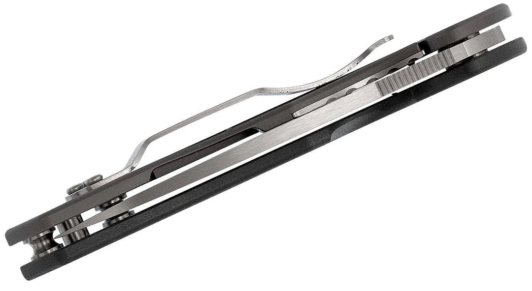 The Brouwer’s slim, ergonomic handle features a matte-finished solid titanium scale and Reeve Integral Lock (R.I.L.) on one side and a textured green G10 scale and nested, skeletonized stainless steel liner on the other. To provide a solid lock-up and long service life, the R.I.L. includes a stainless steel interface that also serves as an overtravel stop to preserve proper spring tension of the lock bar. A reversible stainless steel hourglass clip mounted to the butt end of the handle keeps the knife ready for instant access and offers a choice of left or right-side tip-up carry. It is complemented by a lined lanyard hole that allows the easy attachment of fobs and safety lanyards.