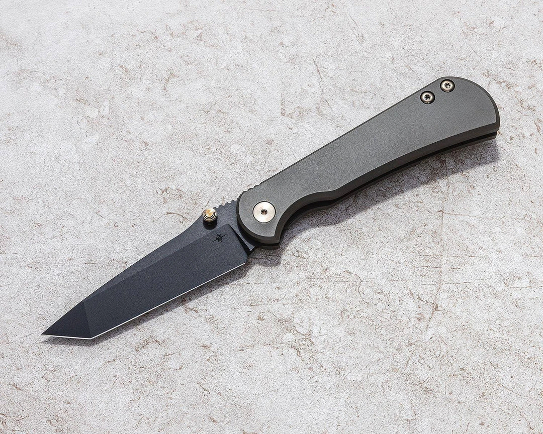 Purposely designed as the ultimate everyday pocket carry workhorse, this version of the Merchant Folder has a standard curved blade shape that allows for smooth cutting and is made entirely at Toor Knives’ shop in San Diego, CA. With an extra-high bevel grind that provides plenty of sharpening life, this frame lock folding knife uses premium 6Al4V titanium precision machined handle scales and a CPM-S35VN blade finished with KG Gunkote for ultimate corrosion resistance. This version of the Merchant features a tanto blade shape, which provides razor-sharp straight edges, an extremely strong tip, and is complemented by a high bevel grind to allow for plenty of sharpening life. Toor custom-makes every screw and backspacer in their manufacturing facility, also using 6Al4V titanium. The blade rides on phosphor bronze washers giving it a smooth controlled folding action and the signature high-ride titanium pocket clip allows the knife to sit higher in the pocket for quicker deployment.