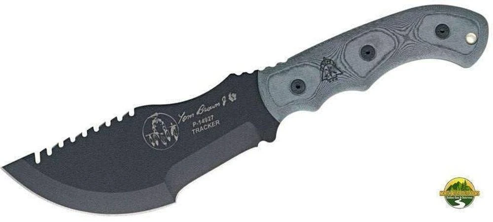 Designed by Tom Brown and featured in the movie “The Hunted” as well as the cover of BLADE Magazine, this is one of the most versatile survival knives ever made. It is designed to chop, saw, skin, engrave, break wire and more. It is made from thick carbon steel and features a milled Micarta handle and tough Kydex sheath. Your chopping pressure can be varied by holding the handle at different points. The knife is made entirely in the USA. One of the most popular knives from TOPS, the Tom Brown Tracker speaks for itself.